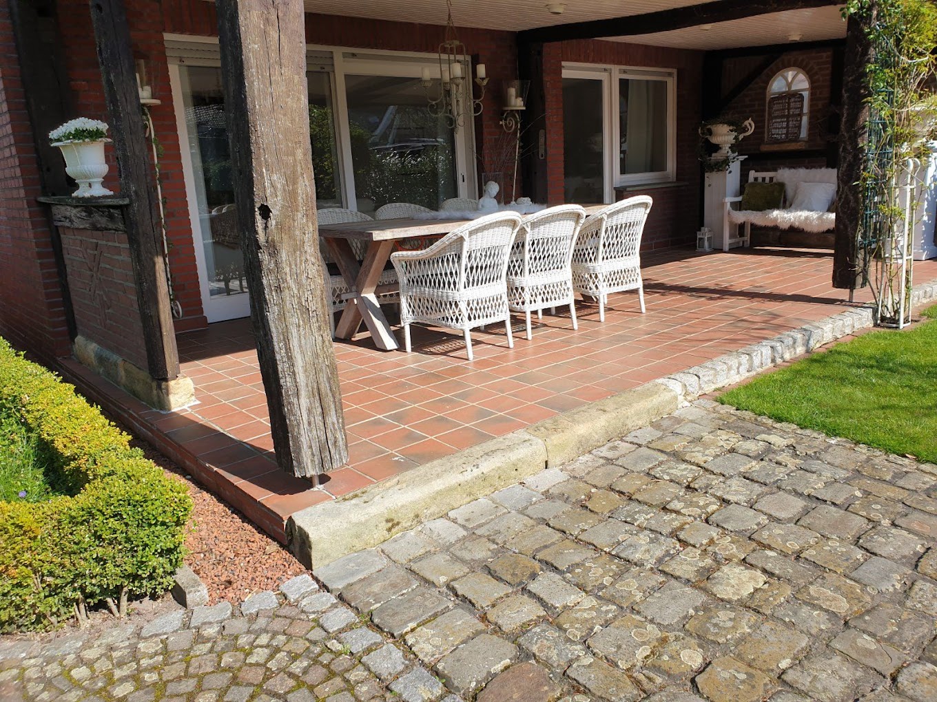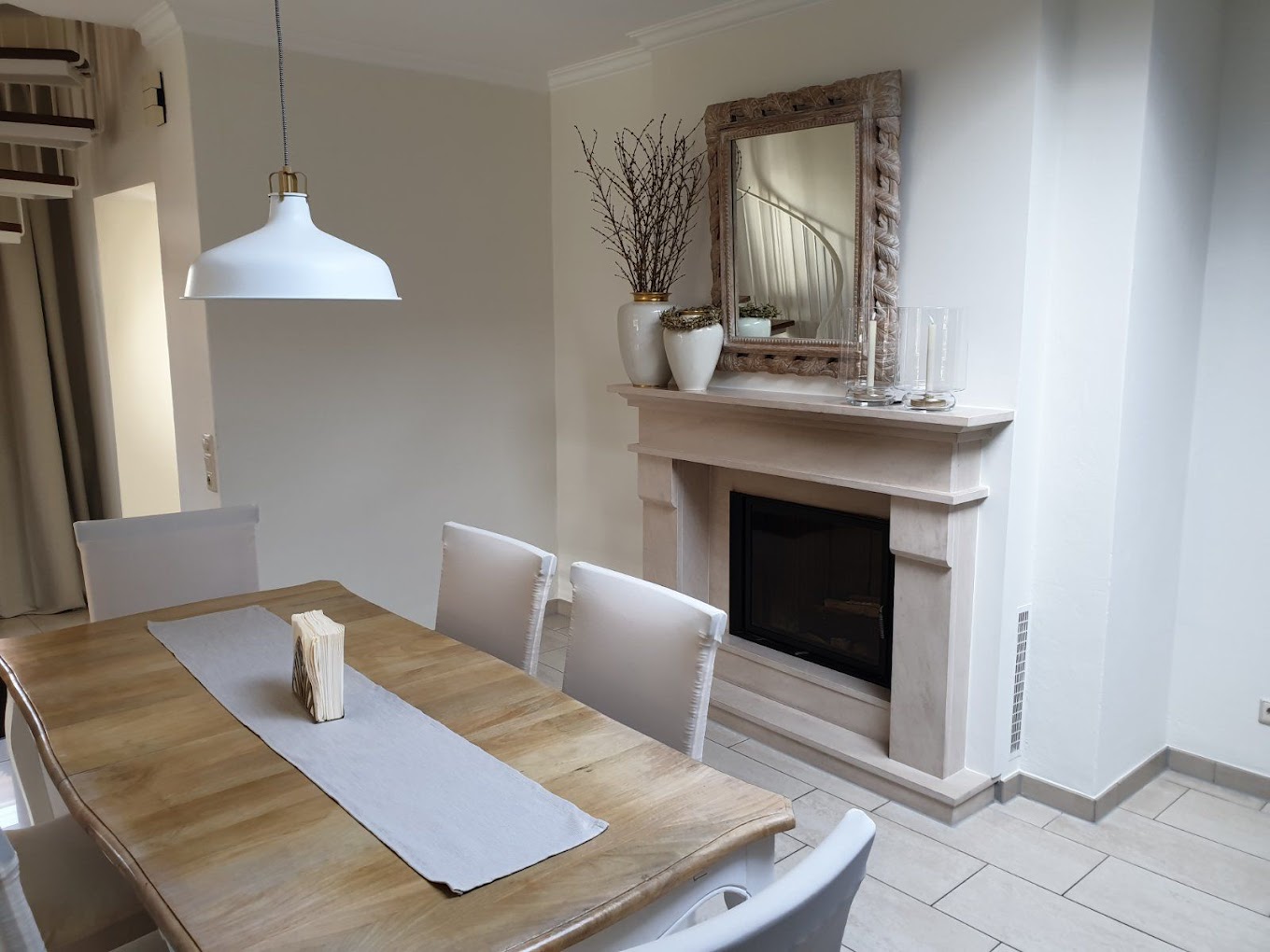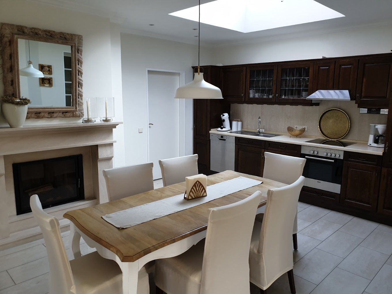 Im Erdgeschoss erwartet Sie ein großer, gemütlicher und offener Wohnraum. Für Ihre Selbstversorgung steht Ihnen eine voll ausgestattete Küche zur Verfügung. Ein Kamin lädt zu entspannten Abenden in gemütlicher Atmosphäre ein. Vom Wohnzimmer (mit TV) gelangen Sie auf unsere große, überdachte Terrasse. Hier können Sie den Abend mit Blick in den Garten genießen. Auf Wunsch stellen wir Ihnen auch einen Grill zur Verfügung.