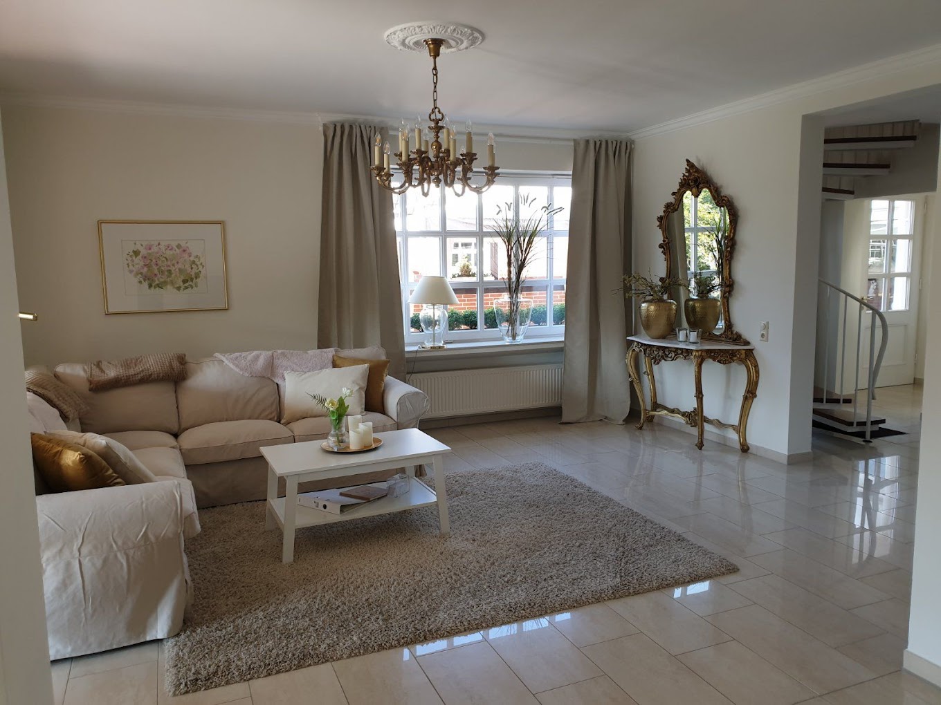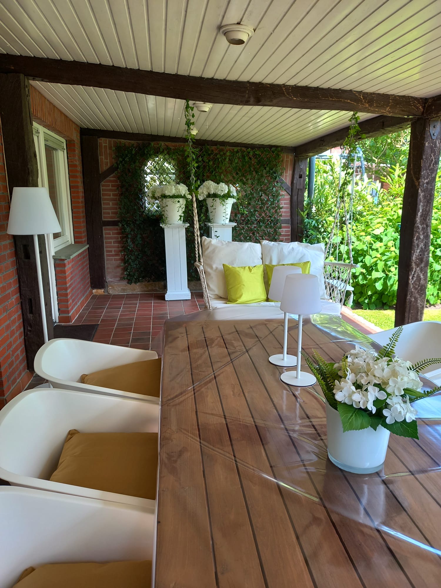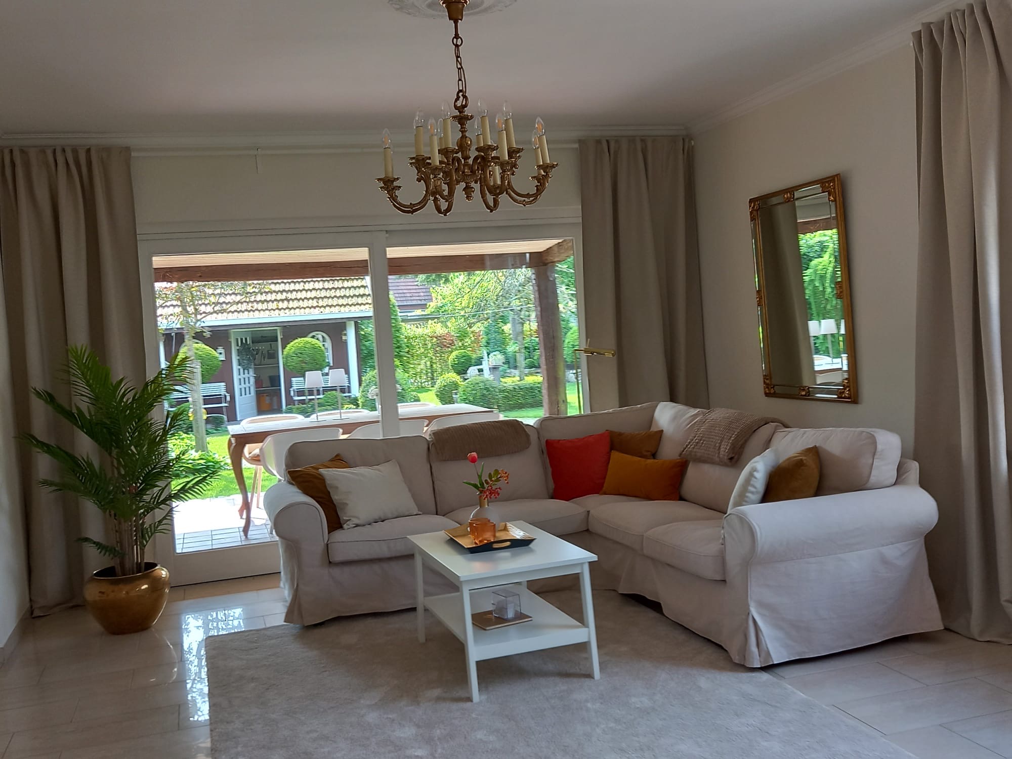 Im Erdgeschoss erwartet Sie ein großer, gemütlicher und offener Wohnraum. Für Ihre Selbstversorgung steht Ihnen eine voll ausgestattete Küche zur Verfügung. Ein Kamin lädt zu entspannten Abenden in gemütlicher Atmosphäre ein. Vom Wohnzimmer (mit TV) gelangen Sie auf unsere große, überdachte Terrasse. Hier können Sie den Abend mit Blick in den Garten genießen. Auf Wunsch stellen wir Ihnen auch einen Grill zur Verfügung.